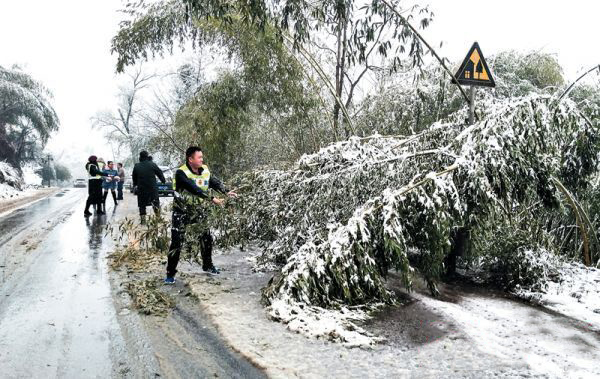 1月16日,受雨雪天氣影響,308省道麻陽(yáng)呂家坪鎮(zhèn)塘坊段道路兩側(cè)竹木被壓彎,侵占道路,...