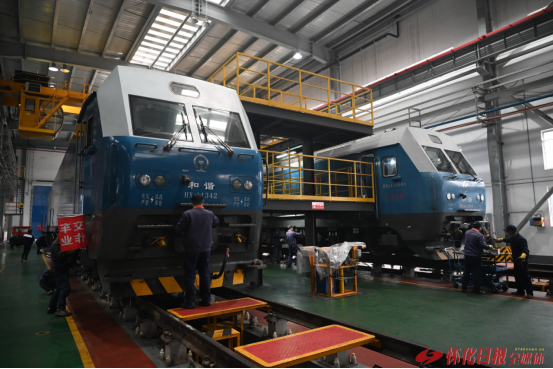 (1月13日,在懷化機(jī)務(wù)段檢修庫內(nèi),3名工作人員位于車上、車中、車下位置同步檢修HXD1型電力機(jī)車。)
