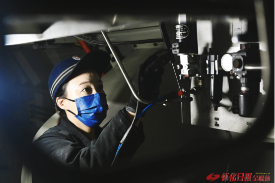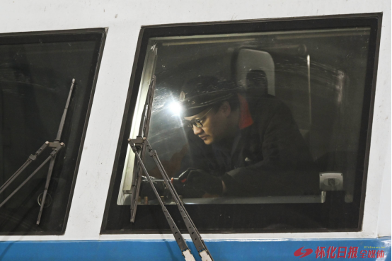 (1月13日,在懷化機(jī)務(wù)段檢修庫內(nèi),工作人員正在檢查HXD1型電力機(jī)車司機(jī)室部件。)